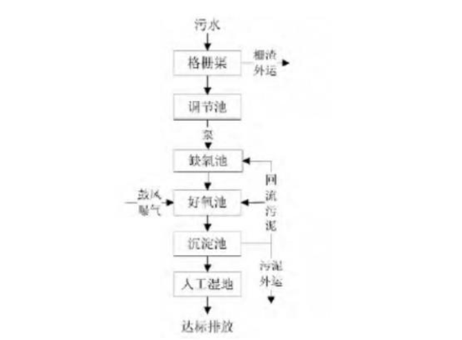 以常规生化处理方式为基础,在人工湿地系统深度处理中增设了地埋A/O-人工湿地技术,从其系统组成结构方面分析,属于人为处理方式能对底面坡度、长宽比合理控制,并用土壤和填料混合组成填料床,使污水在床体的填料缝隙中流动,只需控制床体表面种植性能好、抗水性强、美观、生长周期长等,就可保证水生植物良好生长。在此条件下形成“基质—微生物—植物”复合生态系统,利用该系统净化功能完成水质高效净化工作,并根据地势条件可对污水集中处理,自流出规模适中村庄,处理规模20-200t/天、缺氧池停留时间大于4h,好氧池停留时间大于6h,污泥清理周期180天,人工湿地水力负荷0.5-1.0m3,其工艺流程如图1。