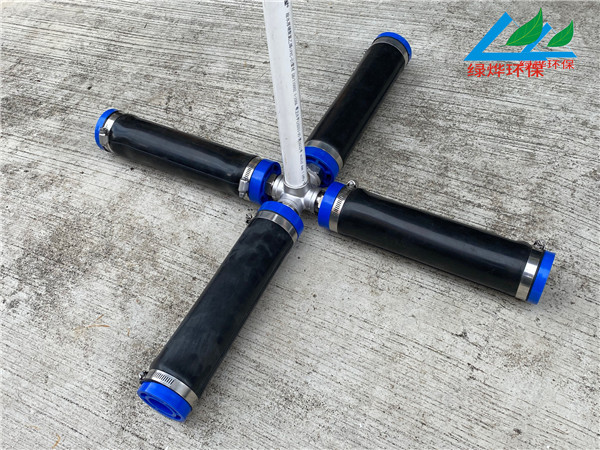 长度在580mm以下采用挤出或模压成型,长度大于580mm采用挤出成型。膜管上以1.5mm大小、2×2.5mm的间距打孔,能产生直径1-3mm的均匀微小气泡。膜管顶部有15mm长无气孔区,当中断供气时膜片立即恢复原状,对空气入口起自动防逆流作用。连接头开有进气口,连接进气管,螺纹为32mm的内螺纹,材质为ABS工程塑料。衬管为给水用、耐压为0.1Mpa,外径为63mm的UPVC管材,管式曝气器的安装方式多样,可以做成传统池底固定方式、可提升方式两种,如是池底固定方式,进气管可以采用90mm、110mmPVC管来连接,如果是做成可提升安装,可有专用的三通或活接来固定,若单条曝气管长度在1米时,安装时,需要要曝气管的尾端固定,以免在曝气管产生晃动,造成中心连接管损坏。