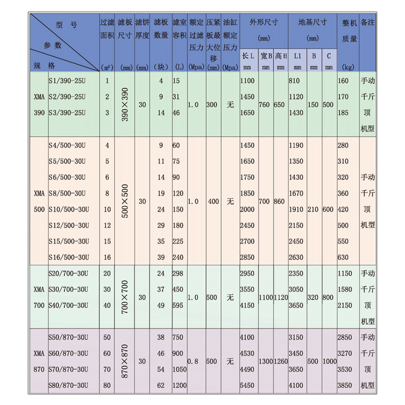 千斤顶压紧压滤机采用螺旋千斤顶作为压紧装置,具有分离效果好,结构简单,操作方便,无需电源,经济实用的特点,一般用于过滤面积 1~20m 的压滤机。它广泛用于石油,化工,染料,冶金,制药,食品,造纸和污水处理。 适用于小液体过滤行业。