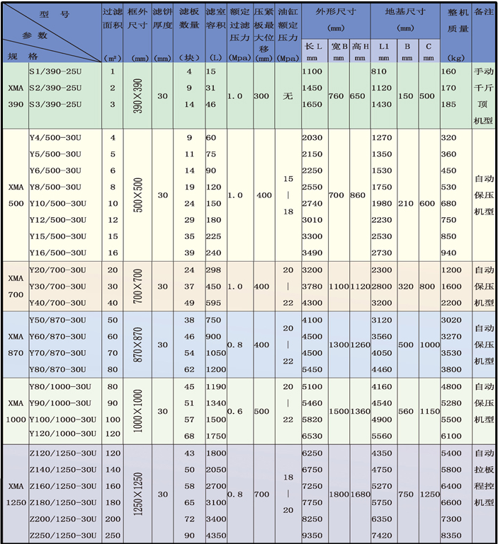 板框压滤机有390、500、870、1000、1250、1500六个系列,过滤面积有1-500㎡。它分有明流可洗、明流不可洗、暗流可洗、暗流不可洗四种;按压紧方式分为手动千斤顶压紧、电动液压、全自动拉板三种。