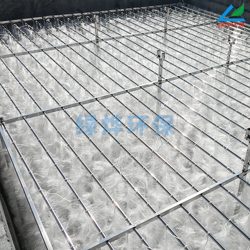 弹性填料筛选了聚烯烃类和聚酰胺中的几种耐腐、耐温、耐老化的优质品种,混合以亲水、吸附、抗热氧等助剂,采用特殊的拉丝,丝条制毛工艺,将丝条穿插固着在耐腐、高强度的中心绳上,由于选材和工艺配方精良,刚柔适度,使丝条呈立体均匀排列辐射状态,制成了悬挂式立体弹性填料的单体,填料在有效区域内能立体全方位均匀舒展满布,使气、水、生物膜得到充分混渗接触交换,生物膜不仅能均匀的着床在每一根丝条上,保持良好的活性和空隙可变性,而且能在运行过程中获得愈来愈大的比表面积,又能进行良好的新陈代谢,这一特征与现象是国内目前其他填料不可比拟的。