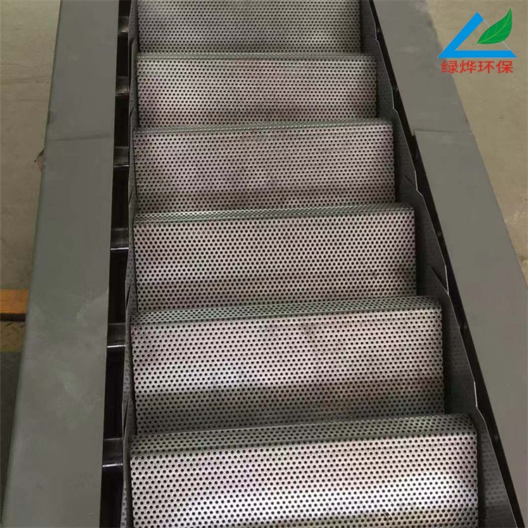 阶梯式网板格栅机的传动用的牵引链轮及导向装置,分别置于机架两侧的上部和下部。阶梯式网板采用ASTM304不锈钢制造,网面为规则排列的小孔,具有过水与截污的功能,台阶面能截留较大的污物。